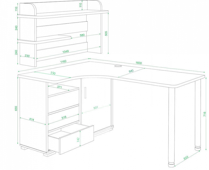 - Комплектация: надстройка:, 2 полки; тумба:, 1 дверца, 3 ящика, полки.