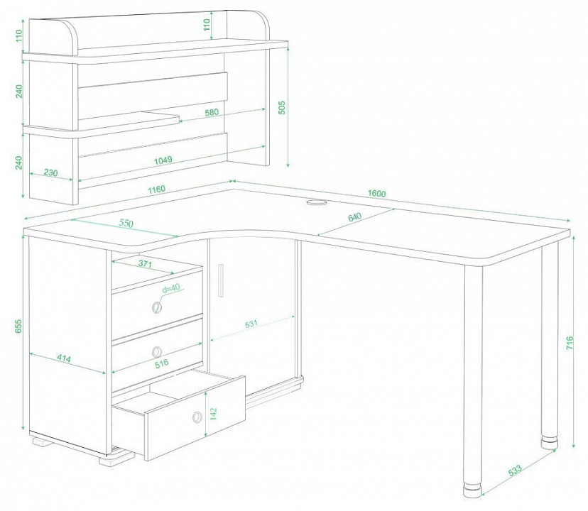 - Комплектация: надстройка:, 2 полки; тумба:, 1 дверца, 3 ящика, полки.