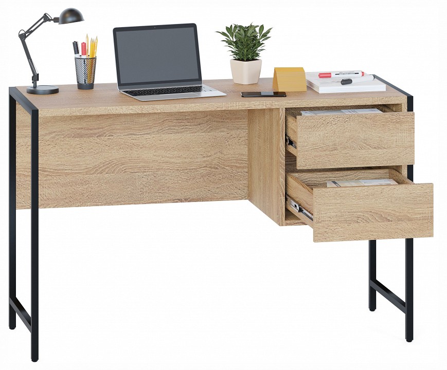 Письменный стол на металлокаркасе СПМ-404 – удобная и элегантная мебель для обустройства домашнего кабинета или учебного места в стиле лофт. Модель компактна за счет столешницы шириной 1130 мм и глубиной 449 мм и встроенной тумбы с двумя выдвижными ящиками. Для плавного и бесшумного открывания ящиков предусмотрены надежные шариковые направляющие, а вместо привычных ручек сделаны стильные вырезы между фасадами. Металлические опоры с регулируемыми подпятниками и столешница толщиной 22 мм с противоударной кромкой сделают рабочий процесс максимально комфортным и продуктивным. Материал опоры: металл. Материал столешницы: ЛДСП толщиной 22 мм, кромка ПВХ 2 мм. Материал каркаса: ЛДСП толщиной 16 мм, кромка ПВХ 0,4 мм. Тип направляющих: шариковые полного выдвижения. Ориентация сборки: универсальная.
