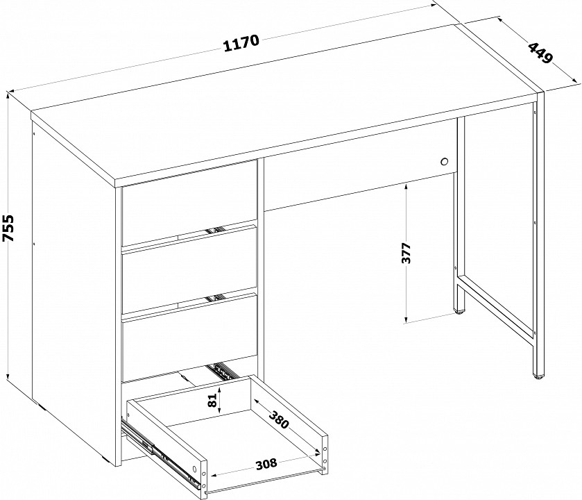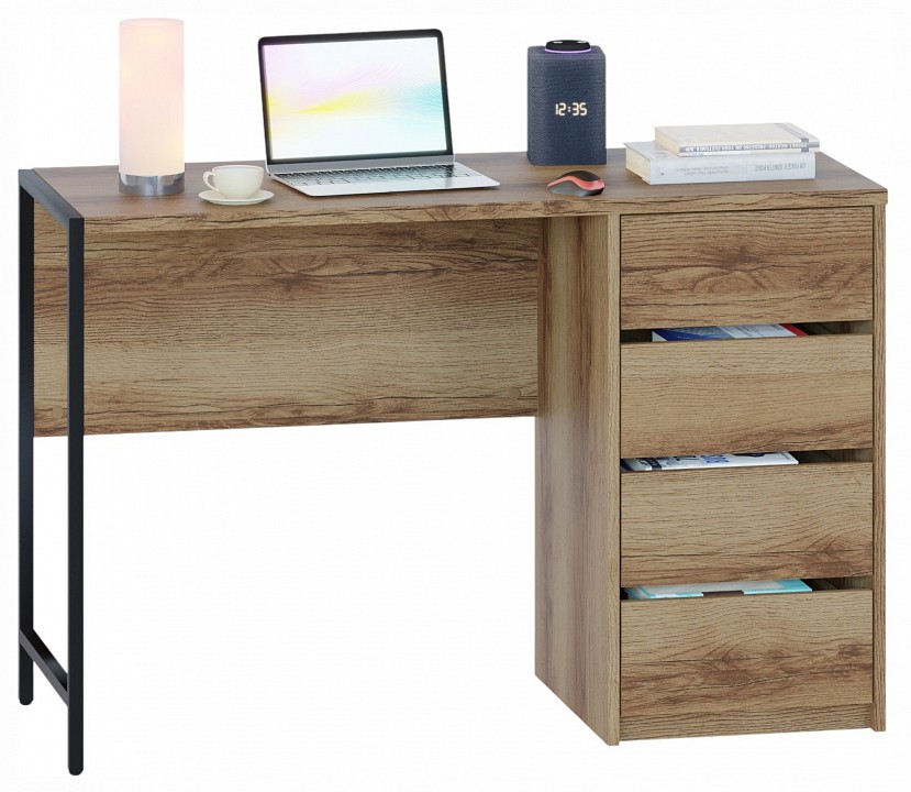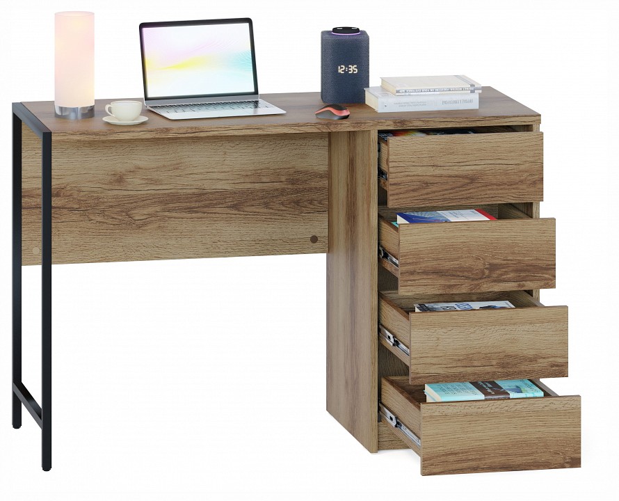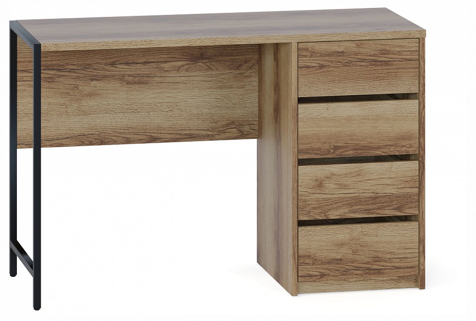 Стильный письменный стол СПМ-405 идеально подходит для организации полноценного рабочего места, эффективно задействуя пространство в доме или офисе. За счет интересного решения с металлическими опорами на регулируемых подпятниках и столешницы толщиной 22 мм с противоударной кромкой создается современная обстановка в стиле лофт. Модель оснащена вместительной тумбой с четырьмя ящиками, а также столешницей шириной 1130 мм и глубиной 449 мм для удобного хранения всей необходимой канцелярии и документов. Ящики с надежными шариковыми направляющими обеспечивают плавное бесшумное открывание, а вместо привычных ручек сделаны стильные вырезы между фасадами. Материал опоры: металл. Материал столешницы: ЛДСП толщиной 22 мм, кромка ПВХ 2 мм. Материал каркаса: ЛДСП толщиной 16 мм, кромка ПВХ 0,4 мм. Тип направляющих: шариковые полного выдвижения. Ориентация сборки: универсальная.