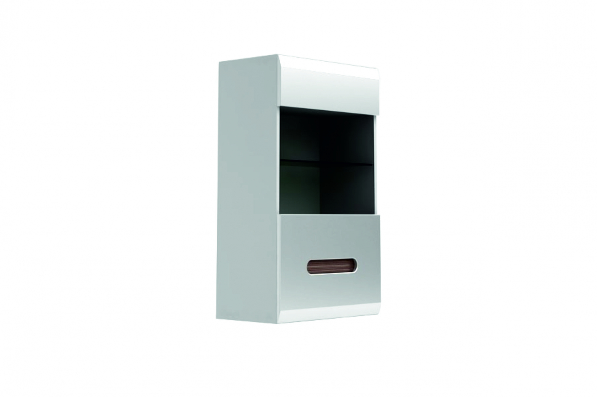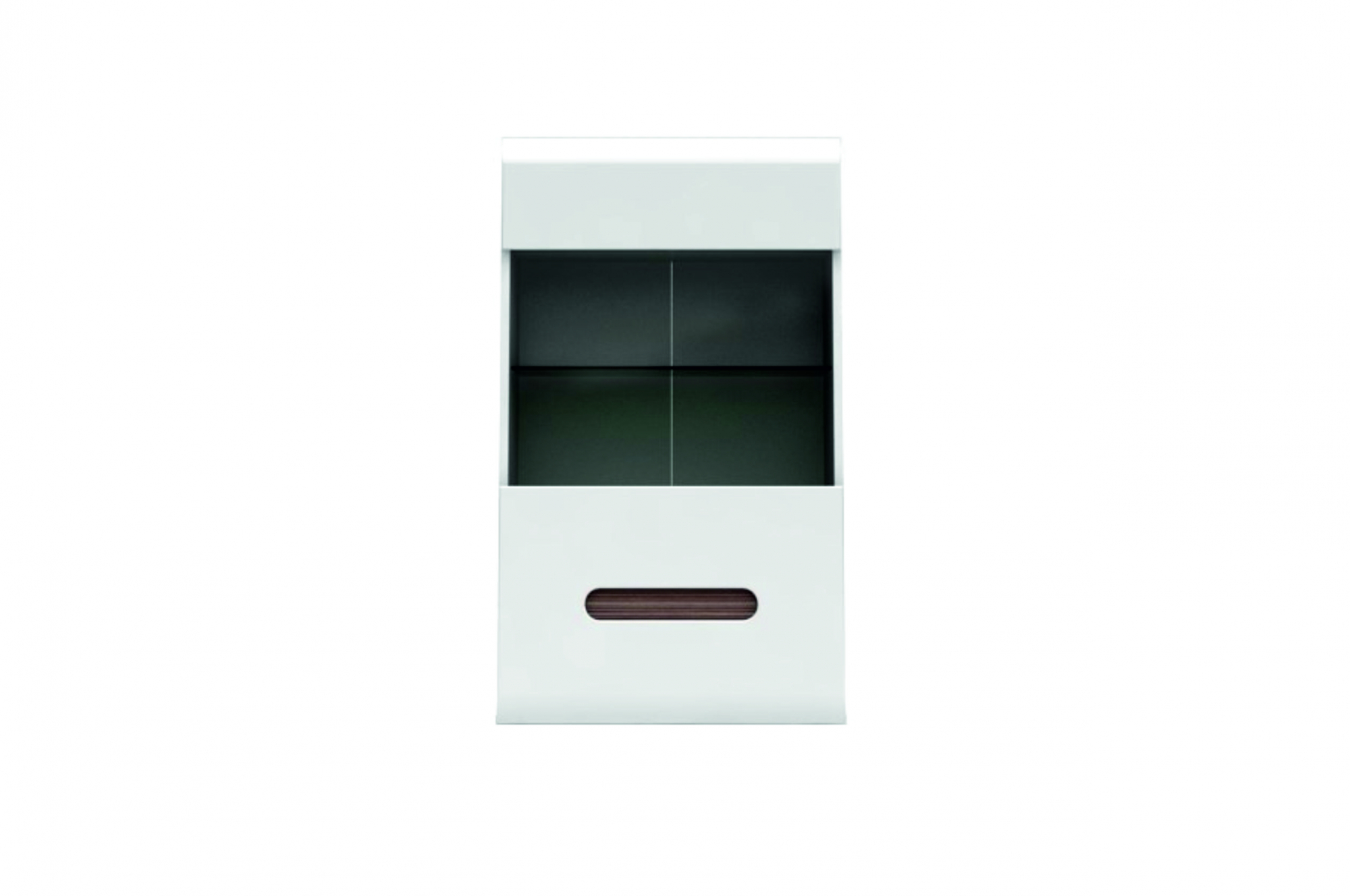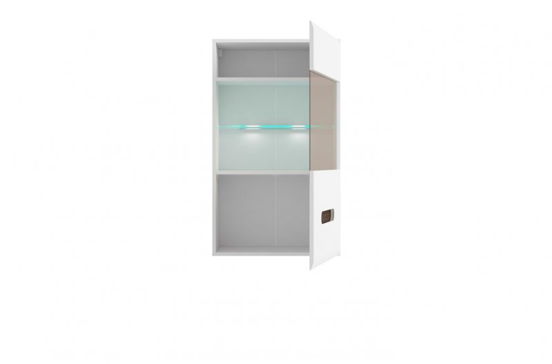 1 распашная дверь со стеклянной вставкой (стекло – закаленное, бронзовое), за которой расположена 1 полка из ДСП ламинированной и стеклянная полка (прозрачное); Дверь может устанавливаться как с правой, так и с левой стороны; Открывание двери осуществляется с помощью интегрированной ручки; Навешивается при помощи металлических кронштейнов;На дверях по верхнему и нижнему краю сделаны закругления;К стеклянной полке крепится светодиодная подсветка белого цвета;Оригинальный и компактный элемент для оформления Вашей гостиной.