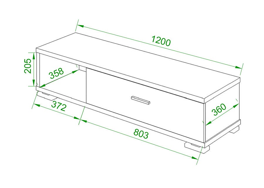 Большая тумба шириной 1200 мм отлично подойдет для обустройства гостиной комнаты, так как благодаря своим большим размерам может заменить ТВ-тумбу. Тумба отлично подходит для хранения одежды, проводов и любых крупных вещей, так как в ней встроен широкий выдвижной ящик. Открытая секция может быть использована для хранения дисков, книг или любых других вещей.
