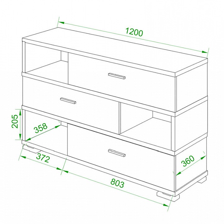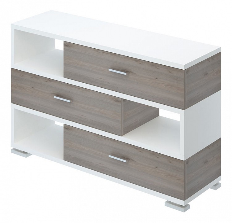 Красивая тумба, которая состоит из трех полок с выдвижными ящиками. Тумба имеет ширину 1200 мм, чего достаточно для использования его в качестве ТВ-тумбы или основы для мебельной композиции в гостиной. Выдвижные ящики достаточно вместительны, чтобы вы могли использовать их для хранения одежды, постельного белья или других больших вещей. А на открытых полках можно держать красивые книги или предметы декора.