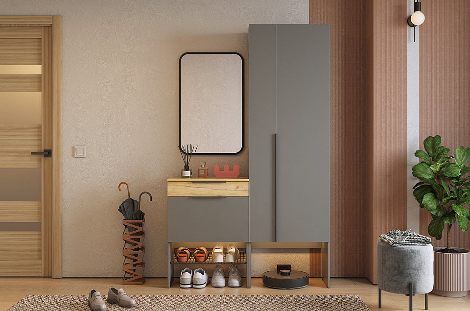 Стенка для прихожей Баско К8 разноцветная графит, дуб крафт золотой, черный 1202x349x1950.