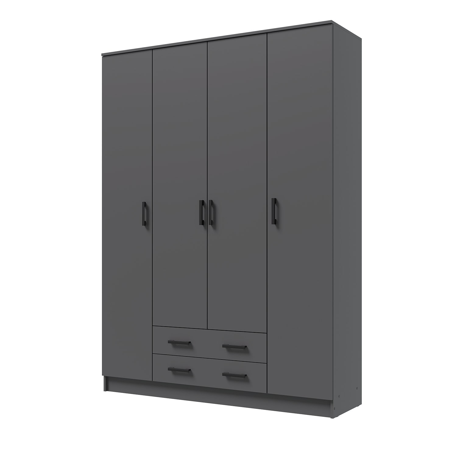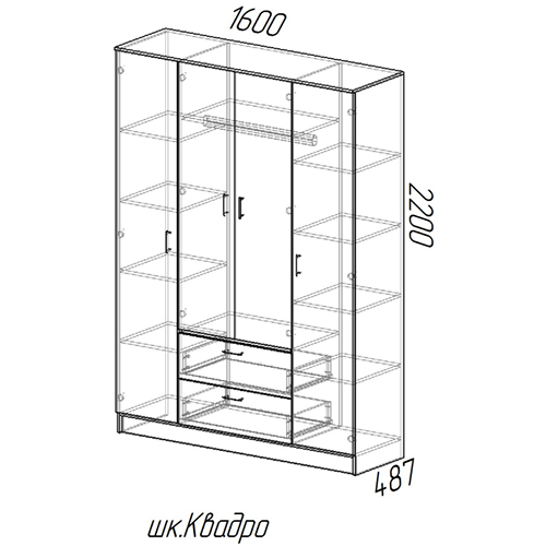 Шкаф оснащен 9 полками и 4 распашными дверями, что позволяет разместить большое количество вещей. В комплекте также предусмотрены 2 ящика для мелочей и аксессуаров.