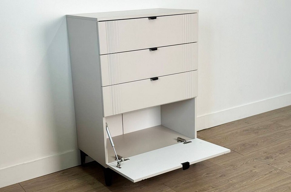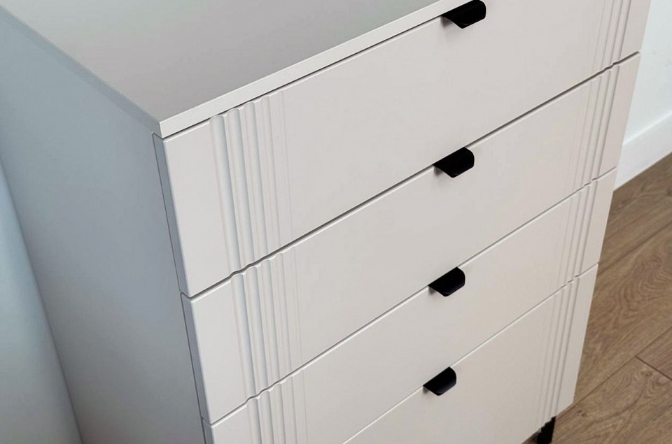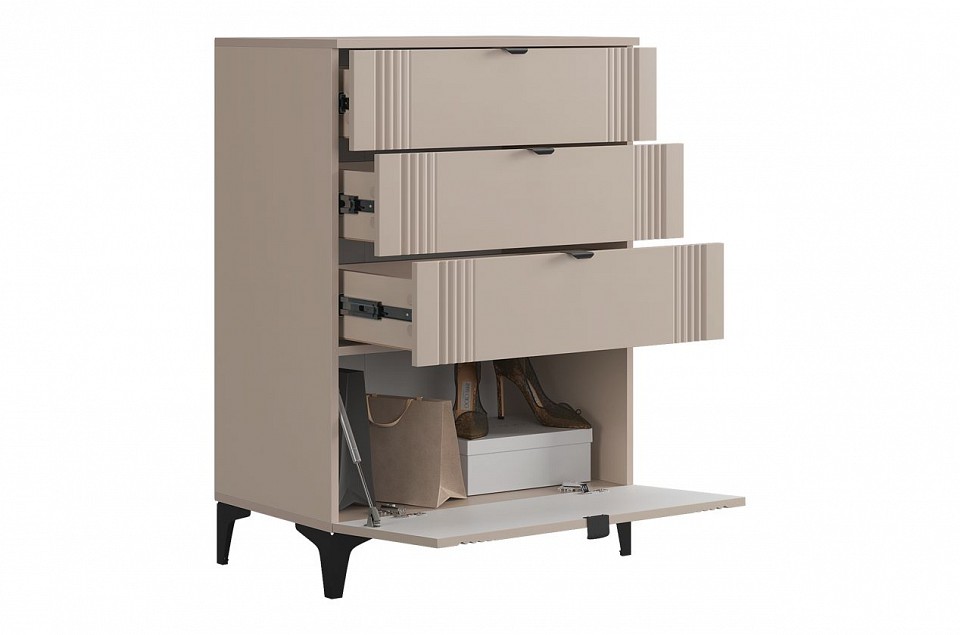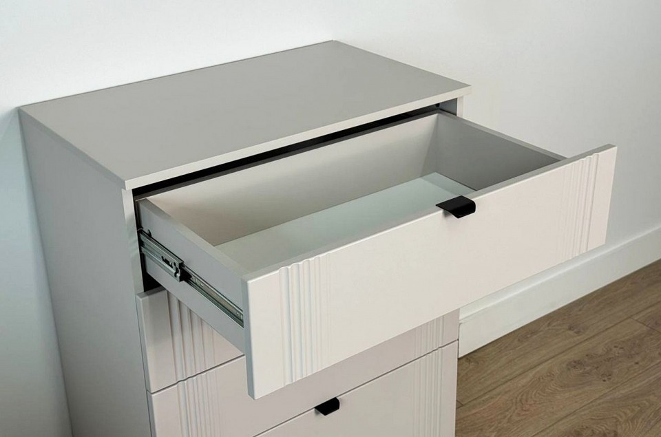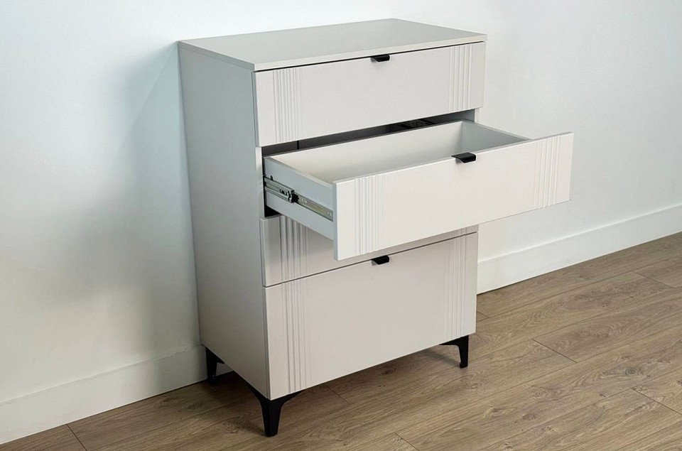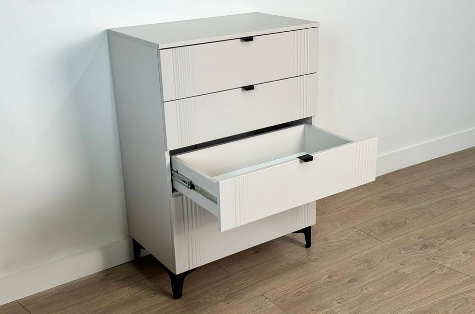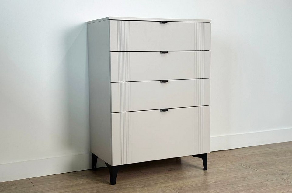 Комод «Рич» - отличное решение для хранения вещей в вашей гостиной, спальне и другой комнате и гармонично впишется в интерьер. Комод изготовлен из качественных материалов: корпус выполнен из ЛДСП, что гарантирует прочность и долговечность, а фасад, выполненный из МДФ в плёнке ПВХ, не только выглядит эстетично, но и защищает комод от повреждений. Особое внимание заслуживает фрезеровка фасадов, которая придаёт изделию изысканный вид. Металлические ручки и выкатные ящики на шариковых направляющих обеспечивают удобный доступ к вещам. Регулируемые металлические опоры гарантируют стабильность конструкции. Благодаря своему дизайну комод «Рич» легко сочетается с другими модулями гостиной «Рич». Выкатные ящики предоставляют достаточно места для хранения различных предметов, что делает этот комод практичным и удобным элементом мебели.