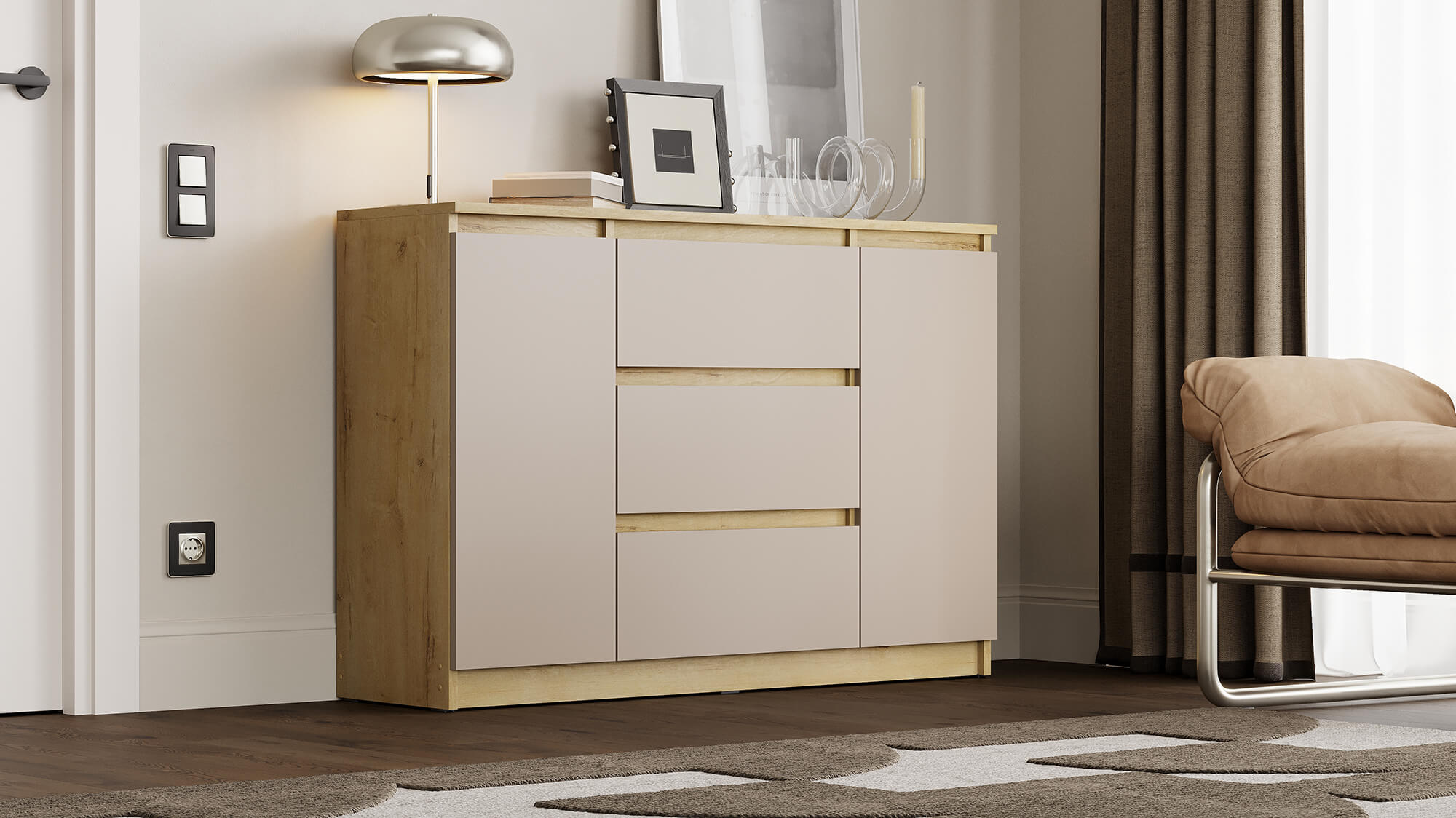 Комод «Вега» — стильное и практичное решение для организации пространства в вашем доме. Модель сочетает современный дизайн с продуманной функциональностью: вместительные ящики и отделение за дверцей позволяют аккуратно хранить одежду, постельное бельё или бытовые мелочи.
