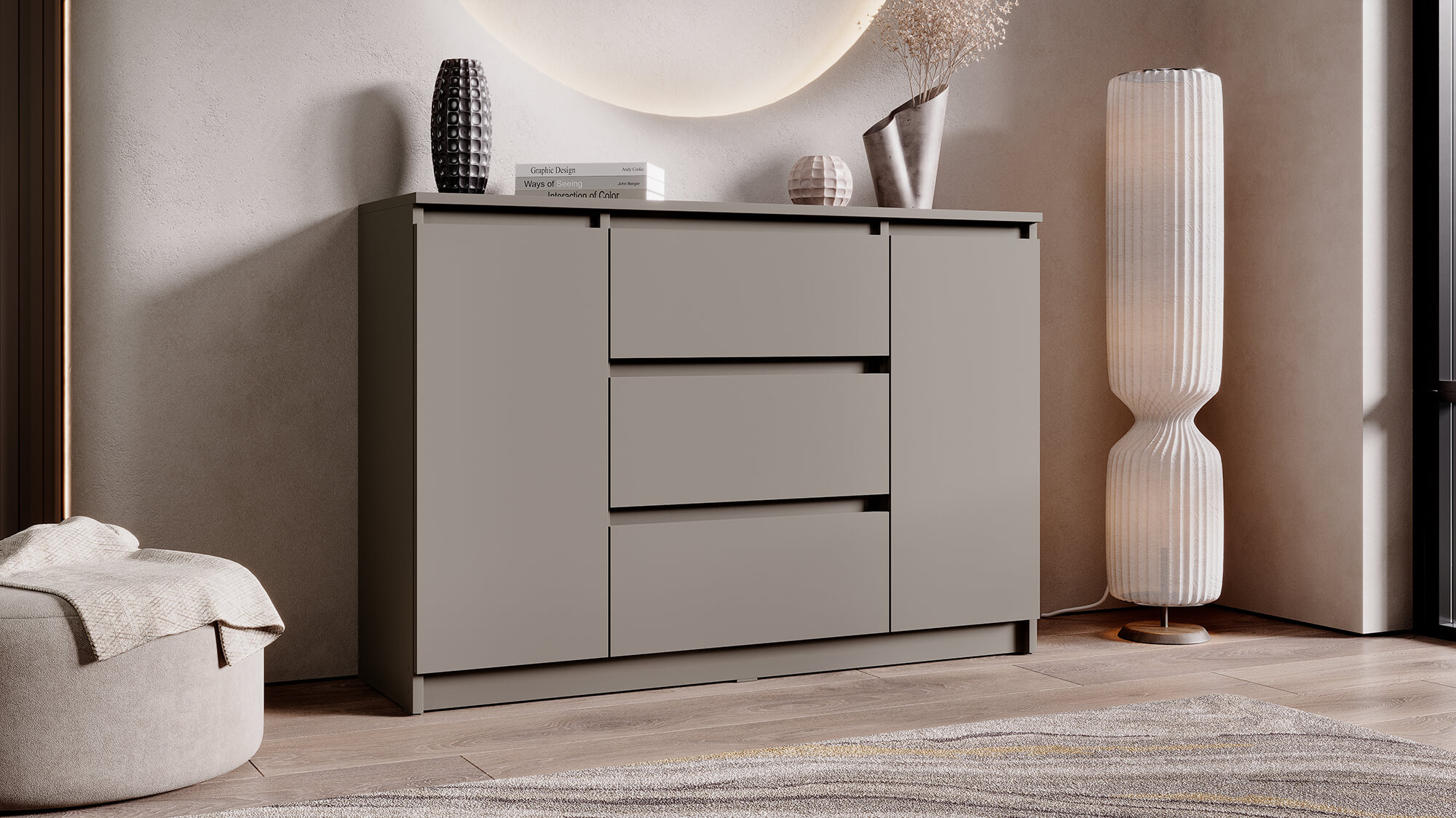 Комод «Вега» — стильное и практичное решение для организации пространства в вашем доме. Модель сочетает современный дизайн с продуманной функциональностью: вместительные ящики и отделение за дверцей позволяют аккуратно хранить одежду, постельное бельё или бытовые мелочи.