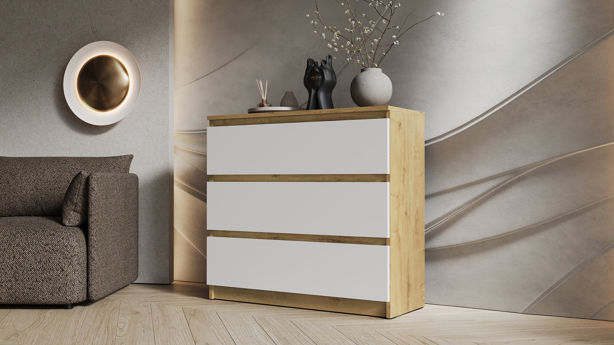 Комод ВЕГА 3Я Дуб Вотан/Белый гладкий