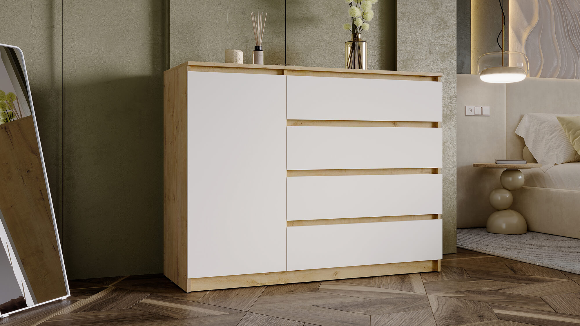 Комод «Вега» — стильное и практичное решение для организации пространства в вашем доме. Модель сочетает современный дизайн с продуманной функциональностью: вместительные ящики и отделение за дверцей позволяют аккуратно хранить одежду, постельное бельё или бытовые мелочи.