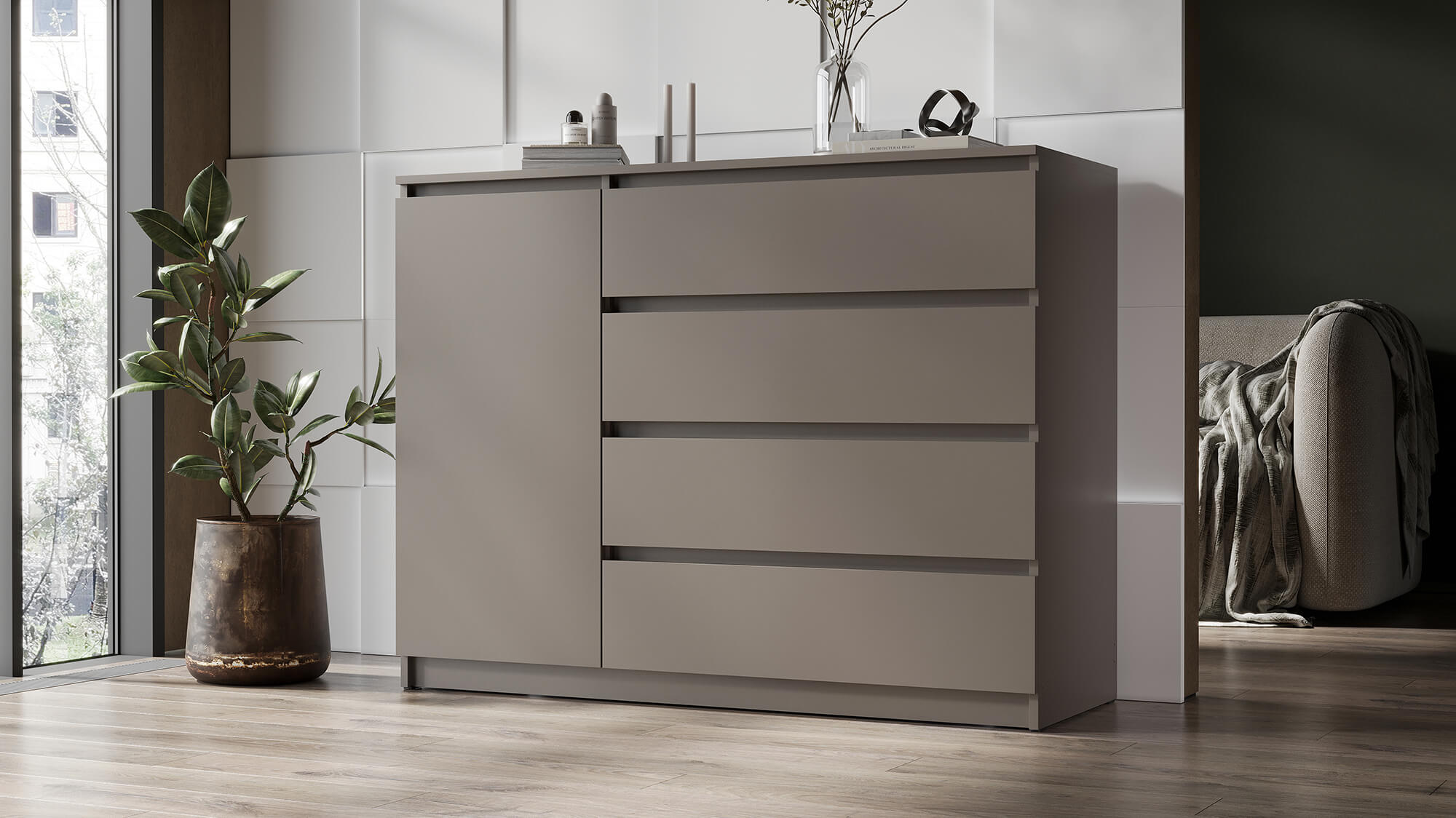 Комод «Вега» — стильное и практичное решение для организации пространства в вашем доме. Модель сочетает современный дизайн с продуманной функциональностью: вместительные ящики и отделение за дверцей позволяют аккуратно хранить одежду, постельное бельё или бытовые мелочи.