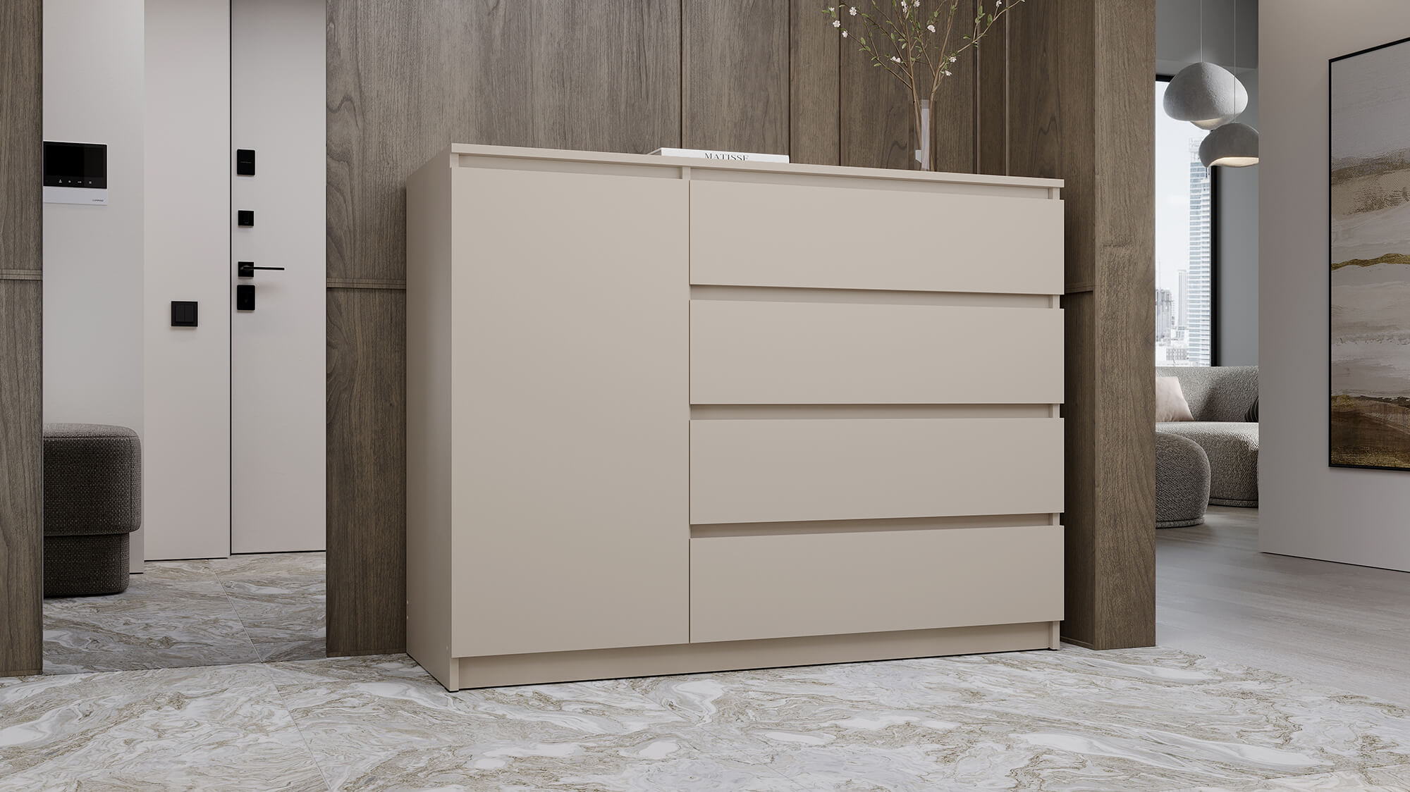 Благодаря лаконичному внешнему виду комод органично впишется в интерьер спальни, гостиной или прихожей. Прочные материалы и надёжная фурнитура гарантируют долгий срок службы, а чёткие линии и стильная цветовая гамма подчеркнут эстетику вашего дома.