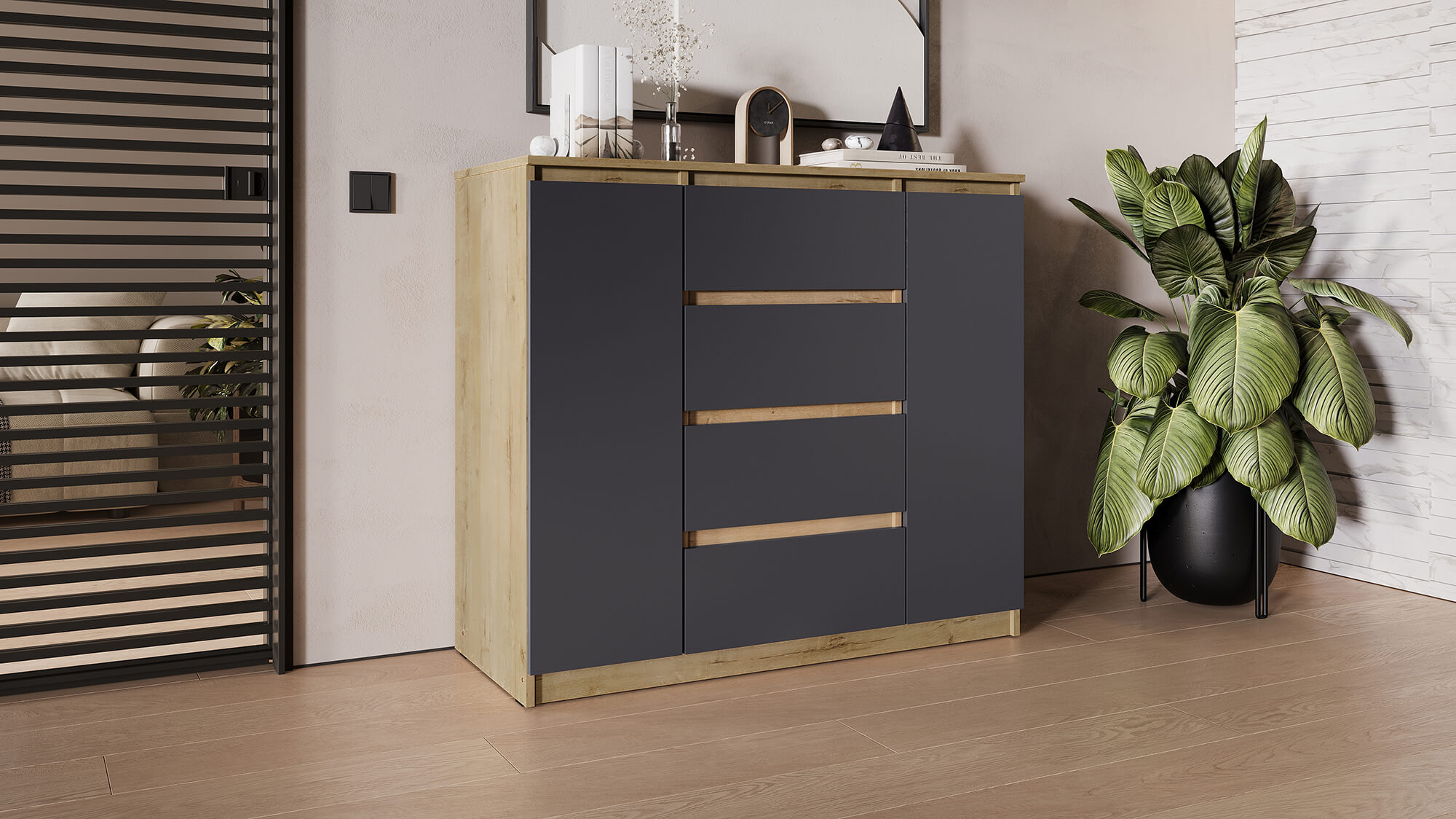 Благодаря лаконичному внешнему виду комод органично впишется в интерьер спальни, гостиной или прихожей. Прочные материалы и надёжная фурнитура гарантируют долгий срок службы, а чёткие линии и стильная цветовая гамма подчеркнут эстетику вашего дома.