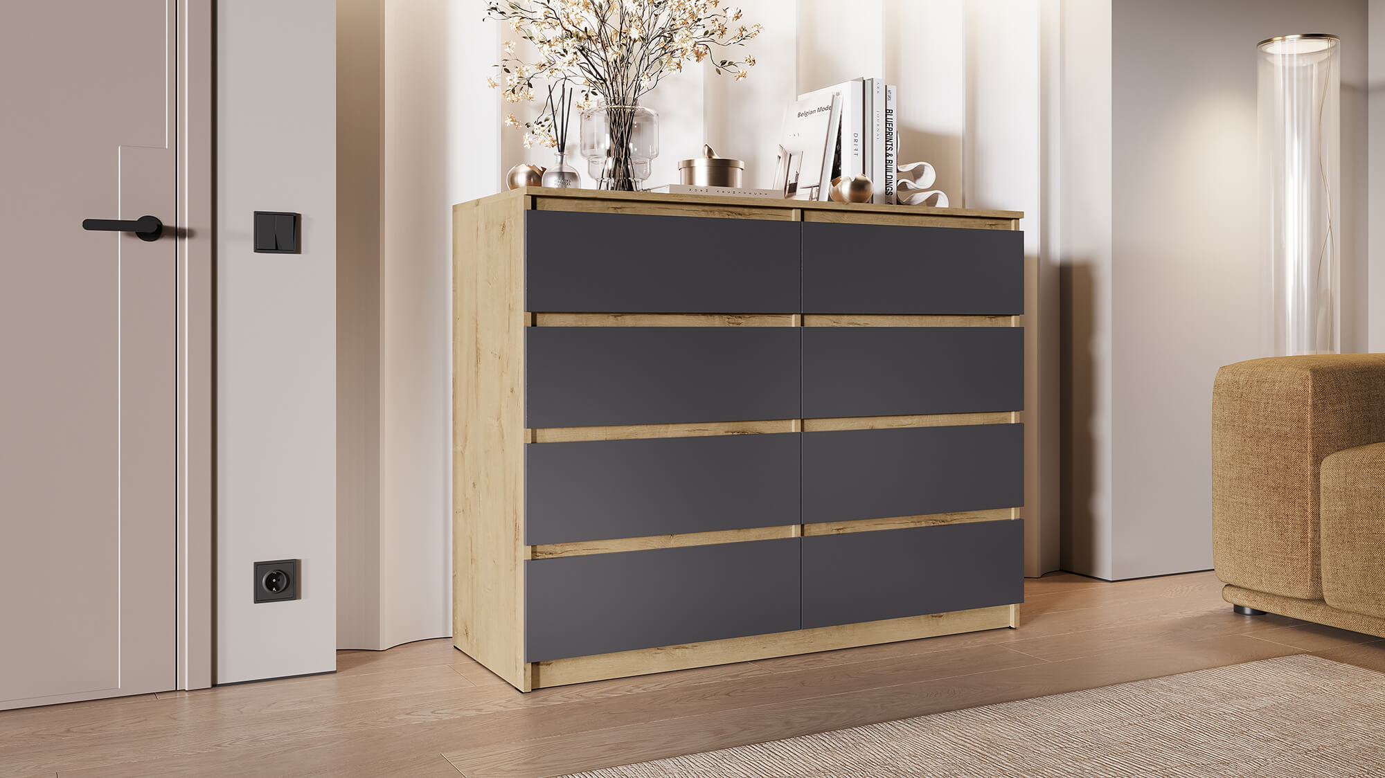 Благодаря лаконичному внешнему виду комод органично впишется в интерьер спальни, гостиной или прихожей. Прочные материалы и надёжная фурнитура гарантируют долгий срок службы, а чёткие линии и стильная цветовая гамма подчеркнут эстетику вашего дома.